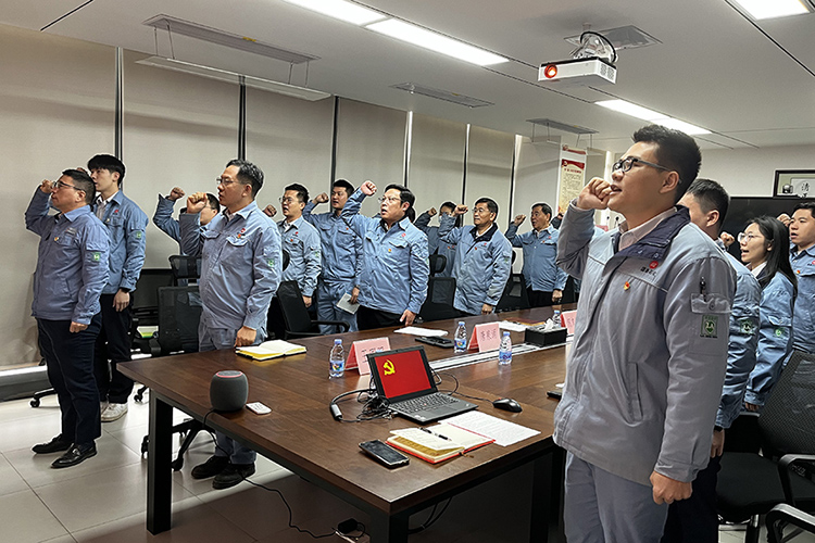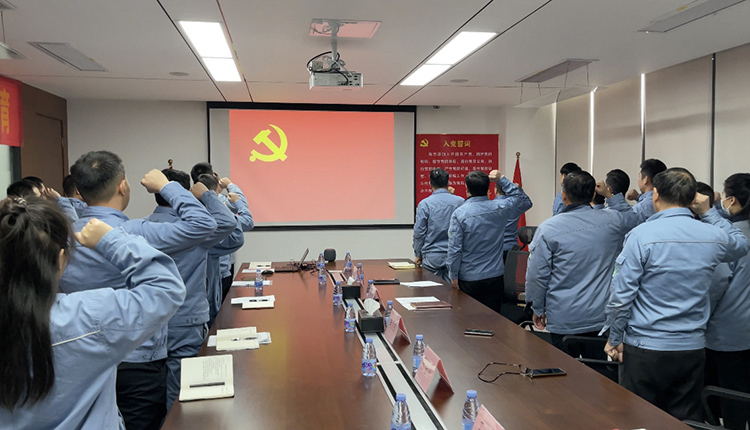 宣誓儀式在莊嚴的《國際歌》中拉開序幕。隨后,在公司黨委書記何文忠的帶領下,預備黨員高舉右拳面向黨旗莊嚴宣誓,其他黨員也一同重溫了入黨誓詞。