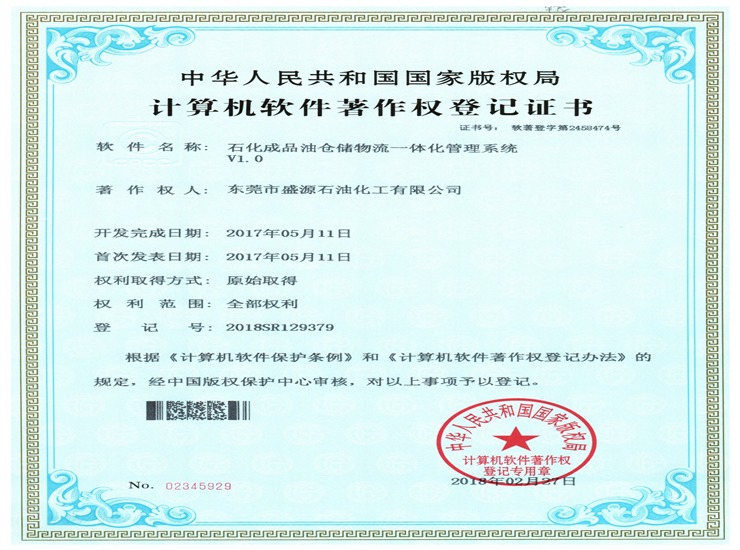 石化倉儲物流一體化管理系統著作權登記證書