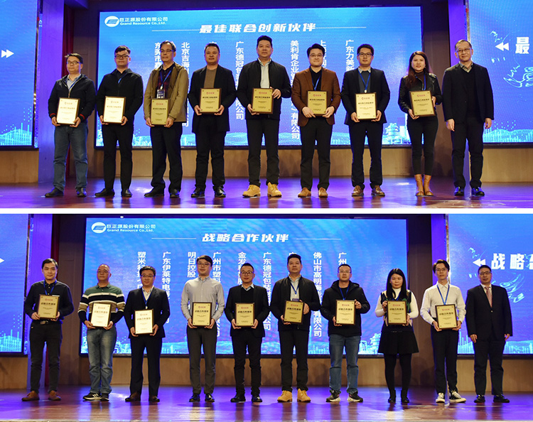 最后,大會向72家合作伙伴頒發年度戰略合作伙伴、優秀客戶、最佳聯合創新伙伴等獎項。廣物控股集團領導、巨正源領導班子為獲獎客戶頒發牌匾。