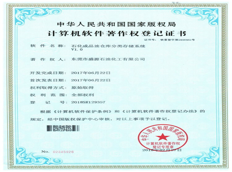石化成品油分類存儲系統(tǒng)著作權(quán)登記證書