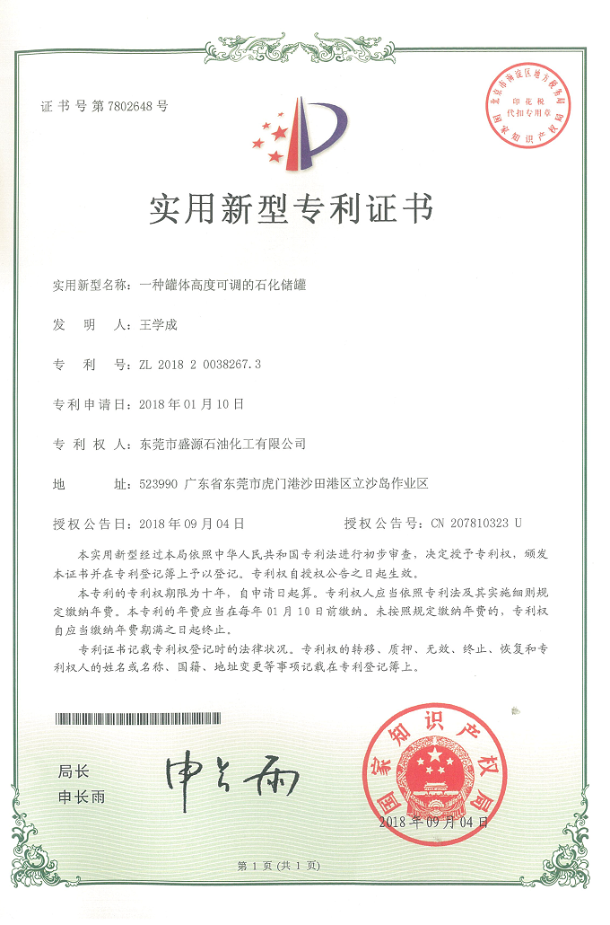 實用新型可調儲罐專利證書